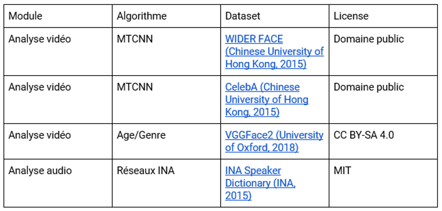 [1]Analyse vidéo (MTCNN) :http://shuoyang1213.me/WIDERFACE/ et http://mmlab.ie.cuhk.edu.hk/projects/CelebA.html / Analyse âge/genre : http://www.robots.ox.ac.uk/~vgg/data/vgg_face2/ / Analyse audio (réseaux INA) : http://recherche.ina.fr/eng/Details-projets/Speech-Trax